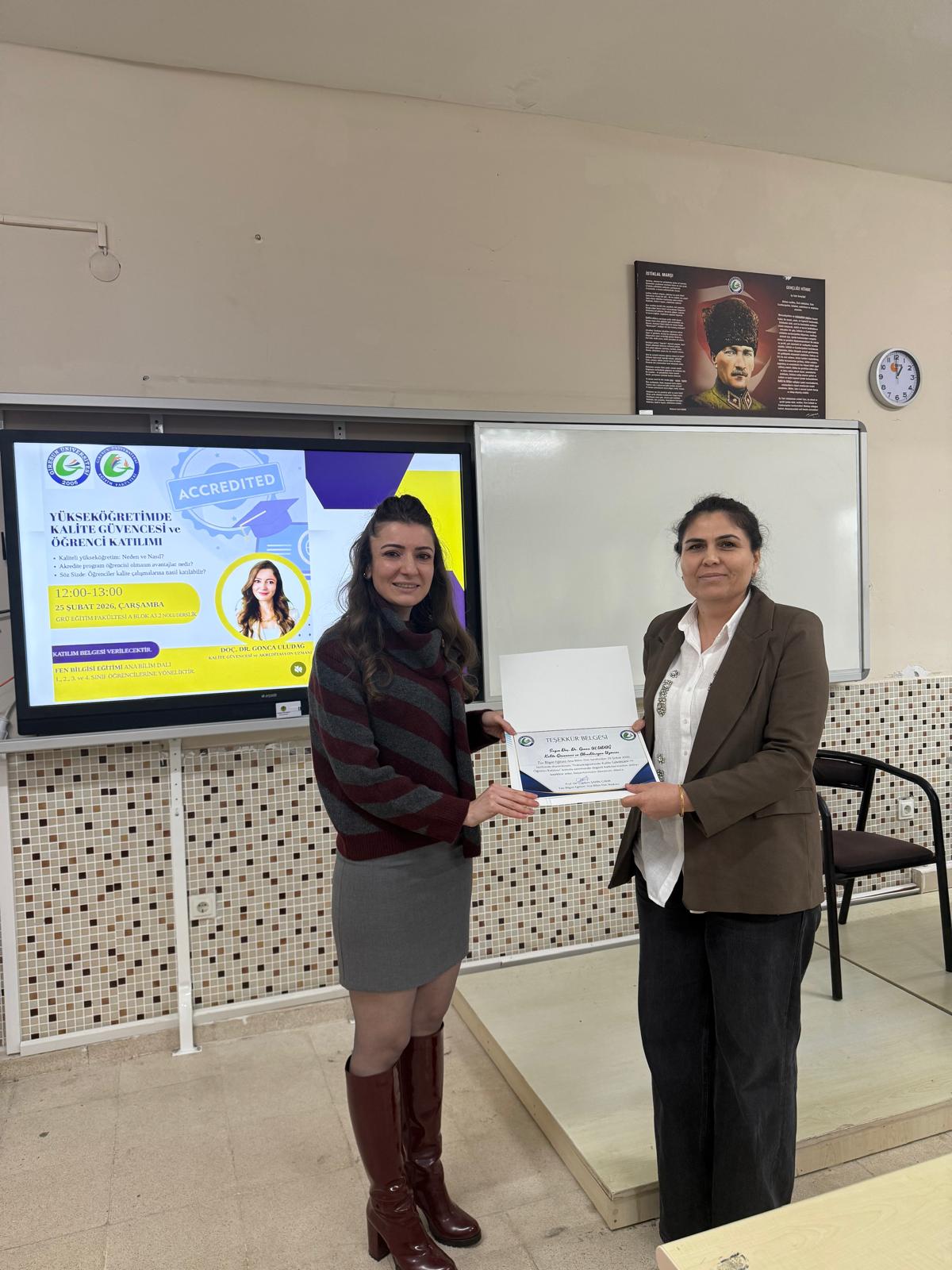 Fen Bilgisi Eğitimi Ana Bilim Dalı tarafından öğrencilerin yükseköğretimde kalite güvencesi süreçlerine yönelik farkındalıklarını artırmak amacıyla düzenlenen “Yükseköğretimde Kalite Güvencesi ve Öğrenci Katılımı” başlıklı seminer, 25 Şubat 2026 Çarşamba günü gerçekleştirildi.