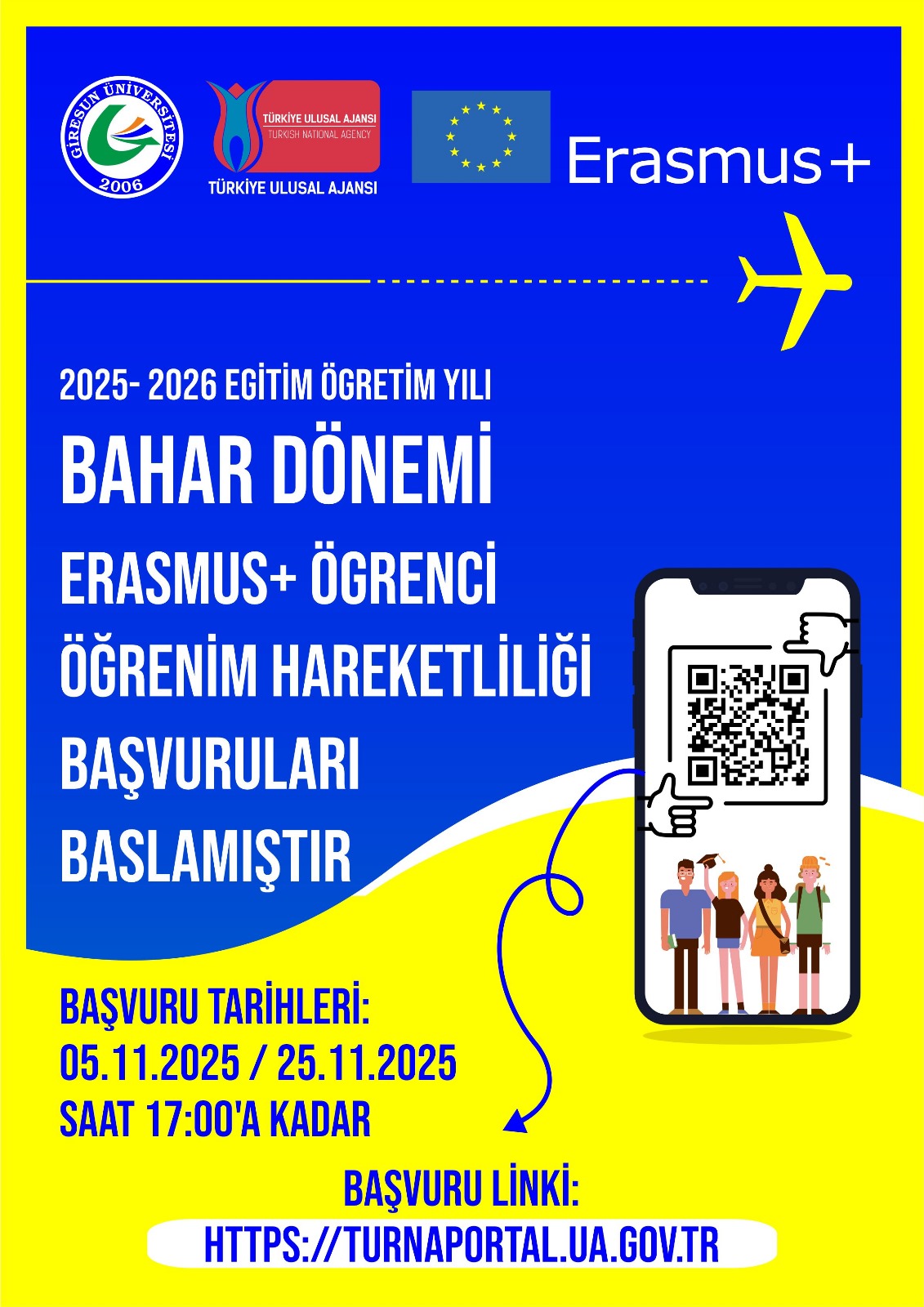 Üniversitemizin yürütücüsü olduğu 2024-1-TR01-KA131-HED-000197240 ve 2025-1-TR01-KA131-HED-000311464 numaralı Erasmus+ projeleri kapsamında, 2025–2026 akademik yılı bahar dönemi “Erasmus+ Öğrenci Öğrenim Hareketliliği” faaliyeti için katılımcı seçim süreci başlamıştır.