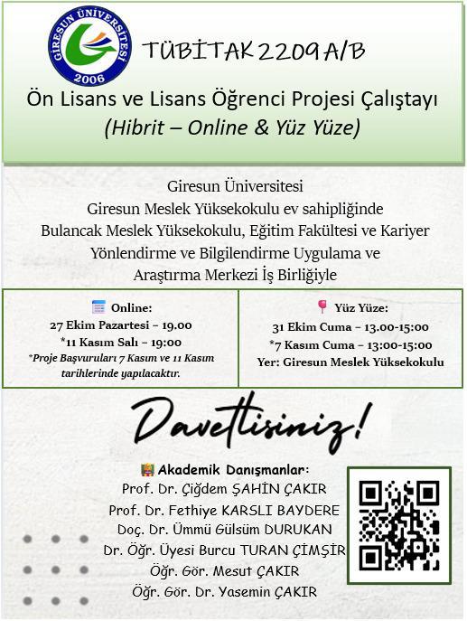 Giresun Üniversitesi Giresun Meslek Yüksekokulu ev sahipliğinde; Bulancak Meslek Yüksekokulu, Eğitim Fakültesi ve Kariyer Yönlendirme ve Bilgilendirme Uygulama ve Araştırma Merkezi iş birliğiyle “TÜBİTAK 2209 A/B Ön Lisans ve Lisans Öğrenci Projesi Çalıştayı” düzenlenecektir.