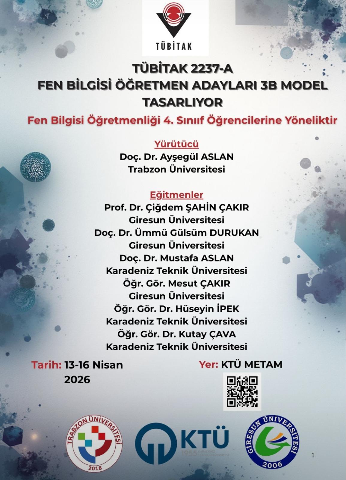Trabzon Üniversitesi, Giresun Üniversitesi ve Karadeniz Teknik Üniversitesi ortak katkısıyla yürütülecek bu proje kapsamında, fen bilgisi öğretmen adaylarının üç boyutlu model tasarım becerilerini geliştirmeye yönelik kapsamlı bir eğitim programı 13-16 Nisan 2026 tarihlerinde gerçekleştirilecektir. Detaylı bilgi için web adresini (https://sites.google.com/view/fen3bmodel) ziyaret ediniz.