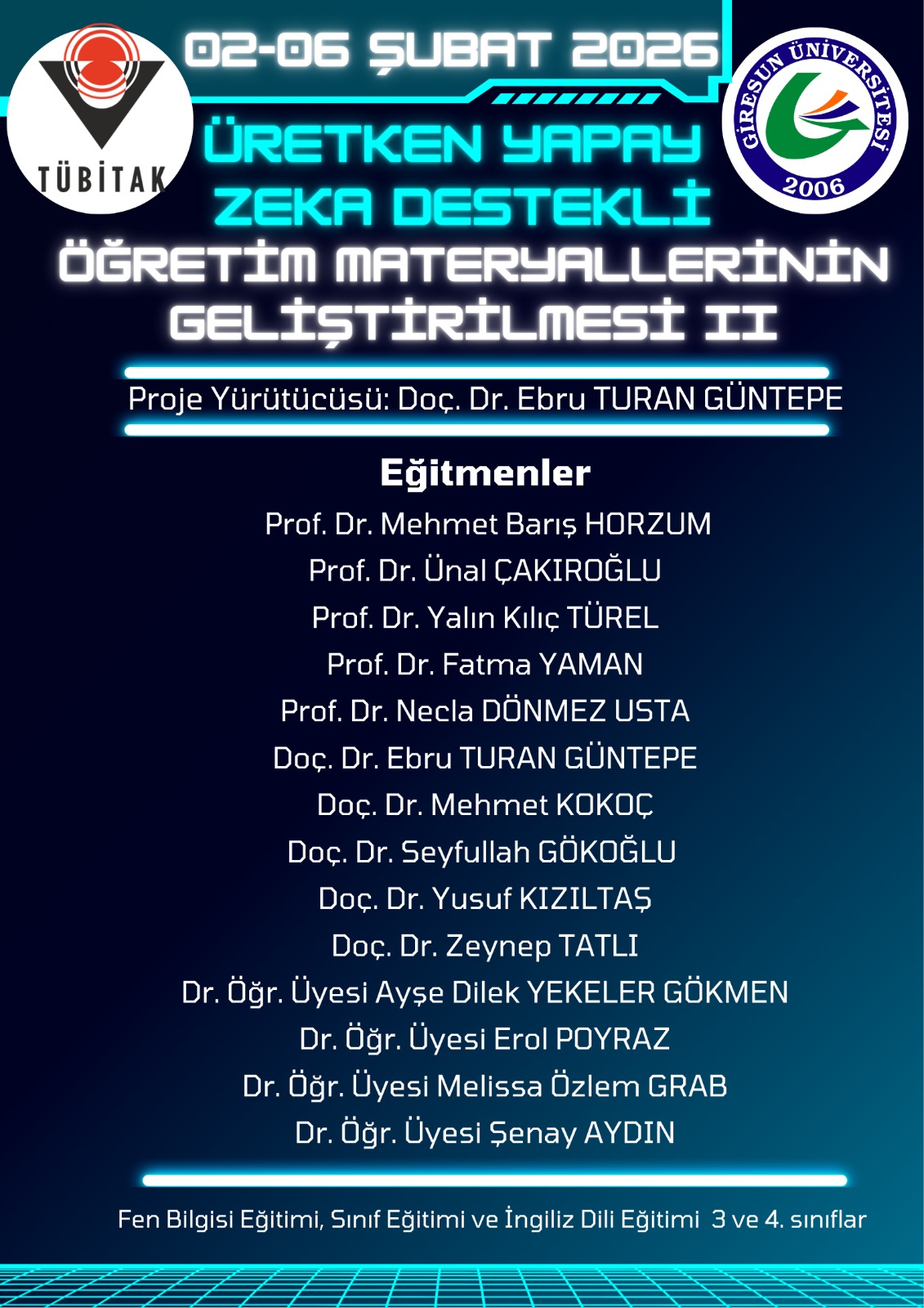 Fakültemiz Öğretim Teknolojileri ABD öğretim üyesi Doç. Dr. Ebru TURAN GÜNTEPE’nin koordinatörlüğünü yaptığı 02–06 Şubat 2026 tarihleri arasında çevrimiçi olarak gerçekleşecek olan “Üretken Yapay Zeka Destekli Öğretim Materyallerinin Geliştirilmesi II” başlıklı bilimsel etkinlik TÜBİTAK-BİDEB 2237A kapsamında desteklenmeye hak kazanmıştır. Etkinlikte öğretim üyemiz Prof. Dr. Necla DÖNMEZ USTA kurul üyeliği ve eğitmen olarak görev alacaktır. Etkinliğe 3. ve 4. Sınıftaki öğretmen adaylarımız başvuruda bulunabilir. Proje ekibini ve hocamızı tebrik eder, başarılar dileriz.